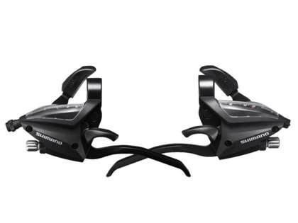 Växelreglage Shimano ST-SF500 3 X 8 Växlar Par STI-reglage (för rakt styre) ST-EF500-8R-4A-Set. Växelreglaget passar på höger och vänster sida på cykeln och är kombinerat med bromshandtag för 4 fingrar inbyggt i reglaget. Växewire och hölje för fram och bakbroms ingår i detta set