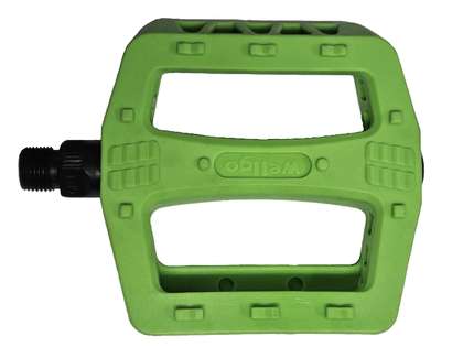 Cykelpedal Wellgo BMX Lime Grön med 9/16 tum gänga, är en modern pedal i plast för BMX-cyklar med delat vevparti. Cykelpedalen passar även till andra typer av cyklar med 9/16 tums gänga i vevarmen och säljes parvis.